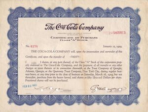 С 1919 года Coca-Cola является публичной компанией[18], её акции размещены на Нью-Йоркской фондовой бирже под тикером «KO»[19]. Купленная в 1919 году за 40 долл. одна акция компании с учётом реинвестирования всех дивидендов в 2012 году стоила бы 9,8 млн долл. (то есть ежегодный рост цены акции составляет 10,7 % с поправкой на инфляцию)[20]. Банк-предшественник SunTrust, получивший в 1919 году 100 тыс. долл. акциями Coca-Cola за андеррайтинг, в 2012 году продал их за 2 млрд долл[21]. В 1987 году Coca-Cola снова вошла в число 30 компаний, чьи акции составляет основу индекса Dow Jones Industrial Average, ранее компания входила в его состав с 1932 по 1935 год[22]. С 1920 года компания выплачивает дивиденды, к 2019 году постоянный рост их размера длится 57 лет[23][24][25][26].