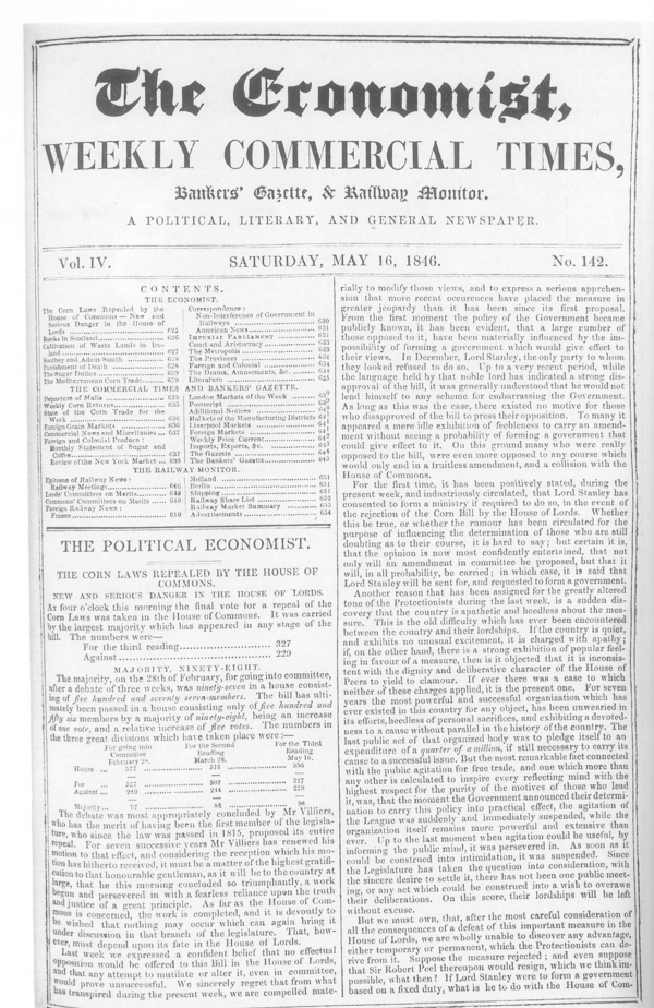 The Economist был основан британским предпринимателем и банкиром Джеймсом Уилсоном в 1843 году, для того чтобы повлиять на отмену хлебных законов[3]. В планах о будущей газете от 5 августа 1843 года перечислялись 13 тем, которые редакторы хотели бы освещать в своем издании[4].