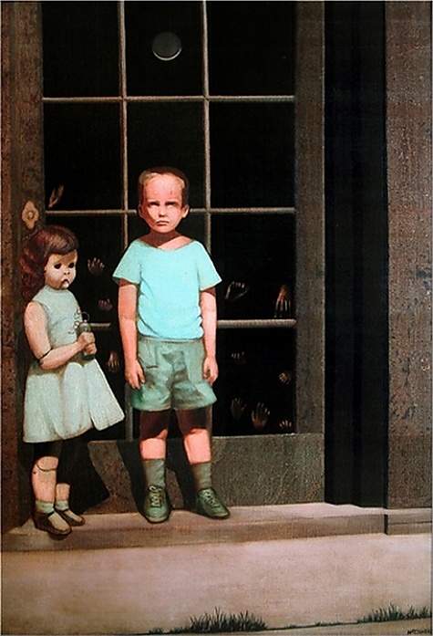 На ней изображены мальчик и кукла-девочка, стоящие на фоне стеклянной двери, к которой с другой стороны прижаты несколько маленьких рук.