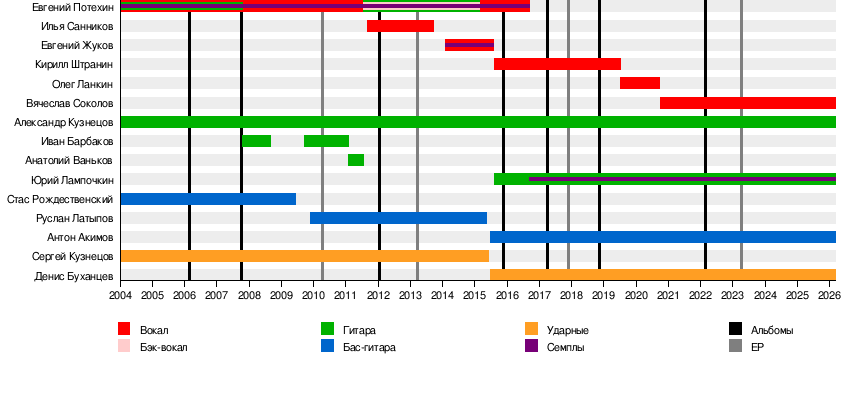 - Евгений «PJ» Потехин — вокал (2003—2011, 2015—2016), гитара (2003—2007, 2011—2015), семплы (2003—2016)