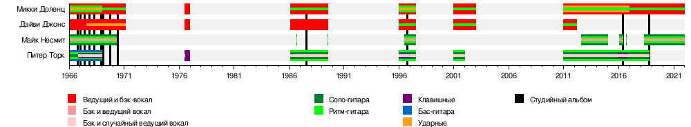 - Майкл Несмит — соло-гитара, клавишные, бэк и ведущий вокал (1966—1970, 1986, 1989, 1996—1997, 2012—2014, 2016, 2018—2021; умер в 2021)