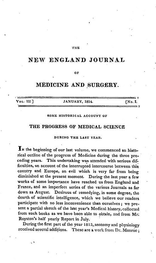 Журнал был основан доктором Джоном Коллинзом Уорреном в 1812 году [4] как выходящее раз в 3 месяца издание под названием The New England Journal of Medicine and Surgery. В течение одного 1827 года он назывался New England Medical Review and Journal. В 1828 году, он стал еженедельником, и был переименован в The Boston Medical and Surgical Journal; столетие спустя он получил своё современное название.