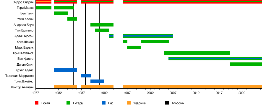 Двумя бессменными участниками группы являются вокалист Эндрю Элдрич и драм-машина, названная Доктор Аваланч, программистами которой являются сессионные музыканты.