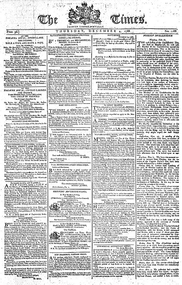 «Таймс» была основана Джоном Уолтером в 1785 году и называлась тогда The Daily Universal Register («Ежедневный перечень новостей»), редактором стал сам же Уолтер. 1 января 1788 года, спустя 940 выпусков, название сменилось на The Times.