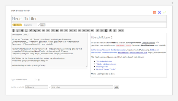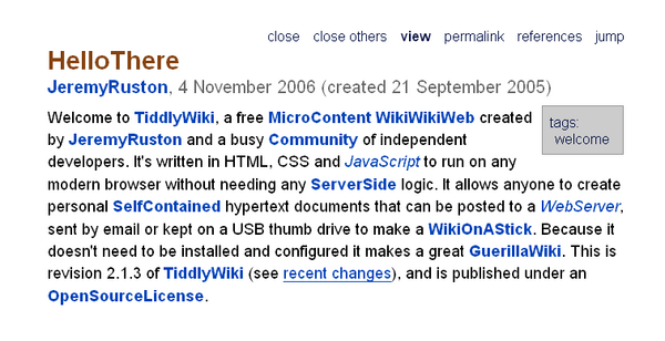 - страниц в обычном понимании в TiddlyWiki нет. В качестве единиц содержимого используются заметки — небольшие порции текста, которые в процессе перемещения по ссылкам образуют ленту просмотра.