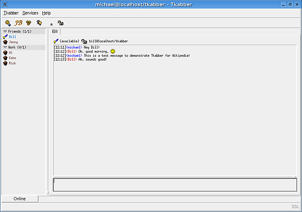 Tkabber — свободный клиент мгновенного обмена сообщениями, поддерживающий протокол XMPP. Написан на Tcl/Tk и работает на многих платформах, включая Linux, BSD, Solaris и Microsoft Windows.