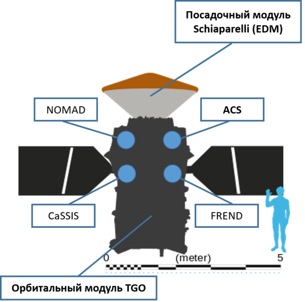 - ACS (Atmospheric Chemistry Suite) — набор из трёх инфракрасных спектрометров для изучения химии и структуры атмосферы Марса. ACS дополнит NOMAD, расширив покрытие инфракрасного диапазона и сможет получать снимки Солнца нужные для лучшего анализа солнечно-затменных данных. Головной исполнитель — ИКИ РАН (Россия). Руководитель проекта — д.ф.-м.н. О. И. Кораблев. Прибор состоит из Эшелле-спектрометра «НИР», работающего в диапазоне 0,7—1,6 мкм, Эшелле-спектрометра «МИР», работающего в диапазоне 2,3—4,2 мкм, и Фурье-спектрометра «ТИРВИМ», работающего в диапазоне 1,7—17 мкм[17].