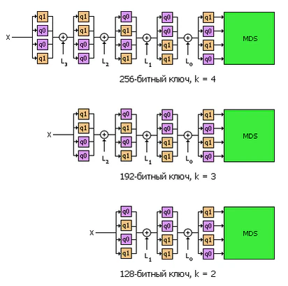 Рассмотрим более подробно алгоритм формирования раундовых подключей, а также зависящей от ключа функции g. Как для формирования подключей, так и для формирования функции g в Twofish используется одна основная функция: h(X, L0, L1, … , Lk). Здесь X, L0, L1, … , Lk — 32 битные слова, а k = N / 64, где N — длина исходного ключа в битах. Результатом функции является одно 32-битное слово.