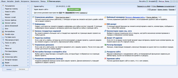 - Широкий выбор конфигурации сайта, от минимума: 3 модуля (Пользователи, Поиск по сайту, Редактор страниц), до максимума: 23 модуля различного назначения. Активация и деактивация модулей на усмотрение владельца-администратора сайта.