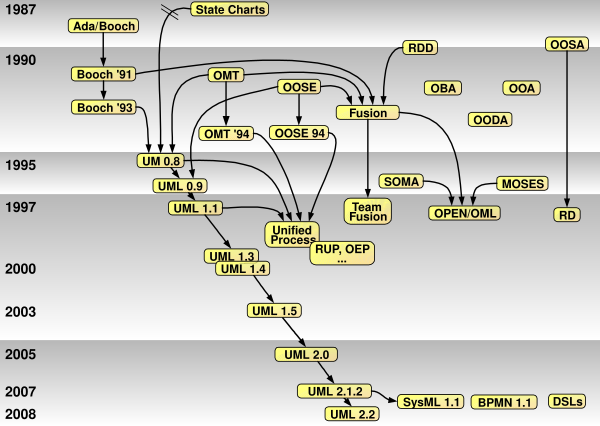 Предпосылки появления языка моделирования UML обозначились в связи с бурным развитием во второй половине XX века объектно-ориентированных языков программирования (Simula 67, Smalltalk, Objective C, C++ и др). Вследствие непрекращающегося усложнения создаваемых программных продуктов возникла нужда в учёте всё новых и новых возможностей языков и средств разработки при анализе, формулировании требований и в процессе проектирования программных приложений. Например, в короткий промежуток времени с 1989 года по 1994 год количество объектно-ориентированных инструментов выросло с десятка до более чем полусотни. Однако многие разработчики затруднялись подобрать язык моделирования, который бы полностью отвечал всем их потребностям. В результате выделилось новое поколение методов разработки, среди которого особую популярность приобрели метод Буча, созданный Якобсоном Object-Oriented Software Engineering (OOSE) и разработанный Рамбо Object Modeling Technique (OMT). Помимо них существовали и другие завершённые технологии, например Fusion, Shlaer-Mellor и Coad-Yourdon, однако всем из них были присущи не только преимущества, но и существенные недостатки[1].