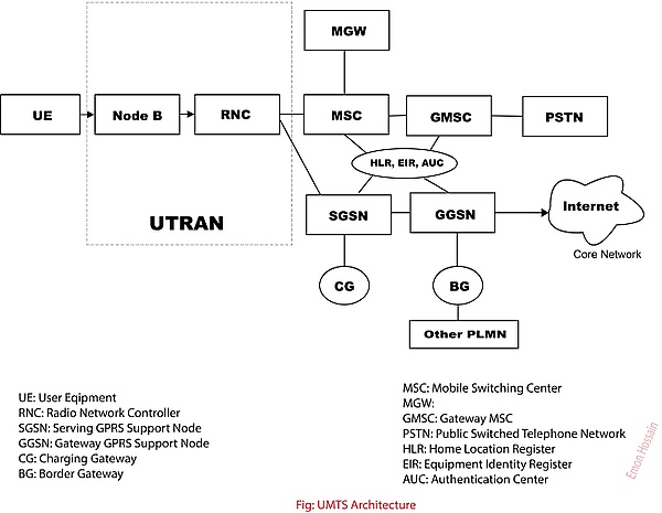 Ядро сети может быть связано с различными магистральными сетями, такими как Интернет или ISDN. UMTS охватывает три нижних уровня модели OSI; управление радиоресурсами (RRM) включает перераспределение каналов между мобильными терминалами и фиксированной сетью, включая хендоверы.