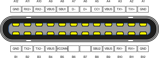 | A3 | TX1- | SuperSpeed дифференциальная пара #1[a], передача- | B10 | RX1- | SuperSpeed дифференциальная пара #2[a], прием- | ||