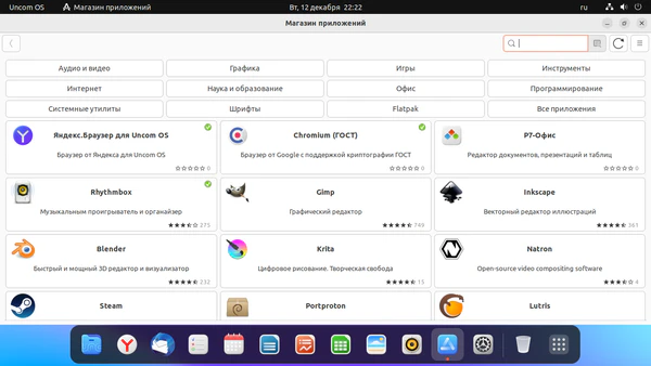 - магазин приложений, базирующийся на собственном репозитории Uncom OS. Каталог насчитывает более 60 тысяч приложений и содержит множество российских программ, в том числе адаптированных непосредственно для Uncom OS, например, Яндекс Браузер и Р7-Офис. Также магазин имеет раздел для обновления Flatpak-приложений. Магазин был основан на исходном коде магазина приложений Linux Mint