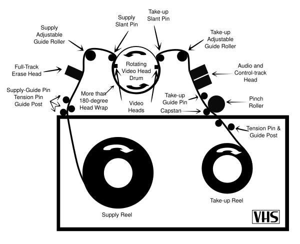 В отличие от формата «Бетамакс», в котором был использован механизм заправки магнитной ленты с поворотной платформой, характерный для всех предыдущих кассетных систем, формат VHS основан на новом принципе так называемой М-заправки[5]. Такой механизм извлекает и заправляет магнитную ленту при помощи двух направляющих вилок, каждая из которых состоит из вертикального ролика и наклонной цилиндрической стойки. Стойки создают точный угол захода ленты на барабан вращающихся головок, обеспечивающий наклон дорожки видеозаписи к базовому краю. Углы захода и схода ленты с барабана равны углу наклона плоскости вращения барабана к основанию механизма, благодаря чему оба рулона кассеты находятся в одной плоскости.
