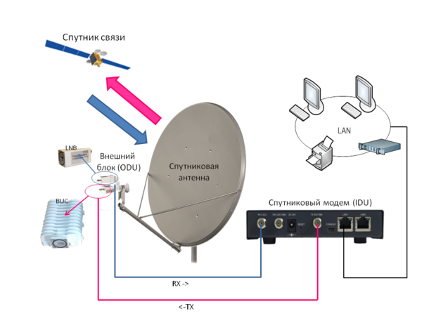 - Абонентский VSAT-терминал обычно включает в себя антенно-фидерное устройство, наружный внешний радиочастотный блок и внутренний блок (модем). Внешний блок представляет собой небольшой приёмопередатчик или приёмник. Внутренний блок обеспечивает сопряжение спутникового канала с терминальным оборудованием пользователя (компьютер, сервер ЛВС, телефон, факс УАТС и т. д.).