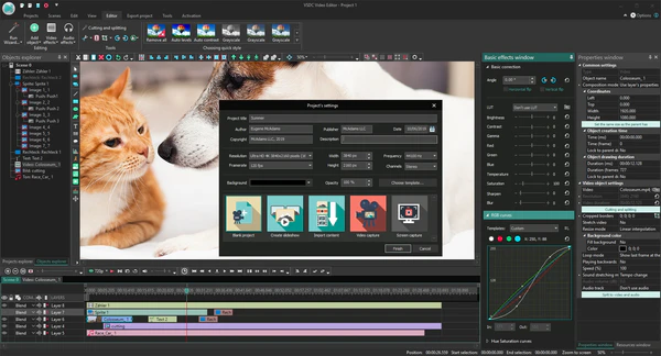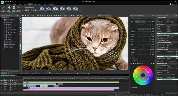 VSDC Free Video Editor — профессиональная программа для нелинейного монтажа и редактирования аудио, созданная компанией Flash-Integro LLC. VSDC способен обрабатывать видеофайлы любого формата и разрешения, включая 4К UHD, а также записи в формате 360 градусов и видео в 3D. Редактор включает профессиональные инструменты цветокоррекции, а также возможность отслеживать движение объектов на видео с помощью модуля Motion tracking. Кроме того, VSDC поддерживает плагины VirtualDub, позволяет записывать видео с экрана рабочего стола, голосовые комментарии, DVD диски, экспортирует файлы без потери качества, а также конвертирует их в нужный формат для дальнейшей загрузки в Instagram, Facebook, YouTube и Twitter.
