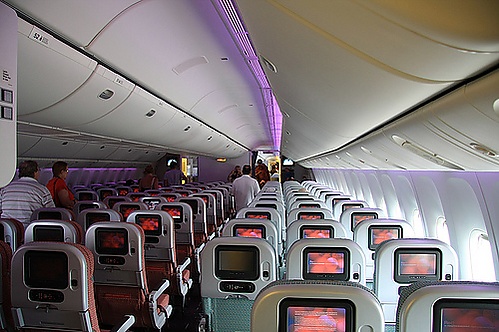 - пассажирские салоны класса International Economy Class[21] самолётов Boeing 777-300ER были скомпонованы по схеме 3-3-3. Кресла имели размеры в длину 81 см, в ширину — 48 см. Пассажирские места были оснащены индивидуальными 9-дюймовыми сенсорными экранами PTV с системой AVOD развлечения в полёте, розетками электропитания для ноутбуков, USB-портами и лампами индивидуального освещения.