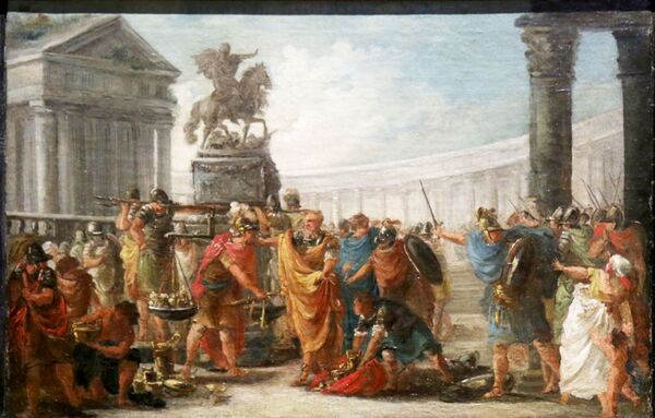 В то время как в городе Вейи наделённый диктаторскими полномочиями Марк Фурий Камилл собирал новую армию, галлы «давали понять, что за небольшую сумму их легко будет склонить к прекращению осады… Сенат уже собрался на заседание и поручил военным трибунам заключить мир. Военный трибун Квинт Сульпиций и галльский вождь Бренн согласовали сумму выкупа, и народ, которому предстояло править всем миром, был оценён в тысячу фунтов золота»[2]. Однако принесённые галлами гири для весов оказались фальшивыми, и, когда трибун отказался их использовать, заносчивый галл, — согласно рассказу Тита Ливия, — бросил на весы ещё и свой меч. «Тогда-то и прозвучали невыносимые для римлян слова: Горе побеждённым!».