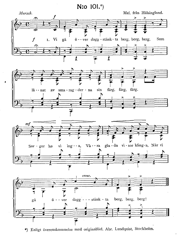 1. Vi gå öfver daggstänkta berg, berg, berg,