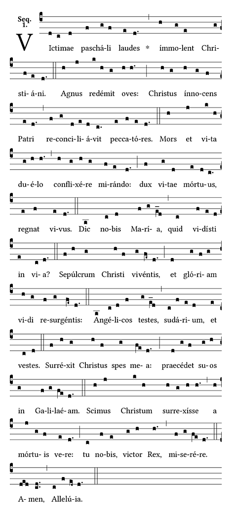 | 1. Victimae paschali laudes immolent Christiani. 2. Agnus redemit oves; 3. Mors et vita duello