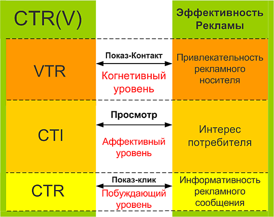 где CTR(v) (англ. Contact through rate based on a view) имеет объективную характеристику оценки захвата внимания потребителя в целом на всех трёх стадиях взаимодействия.