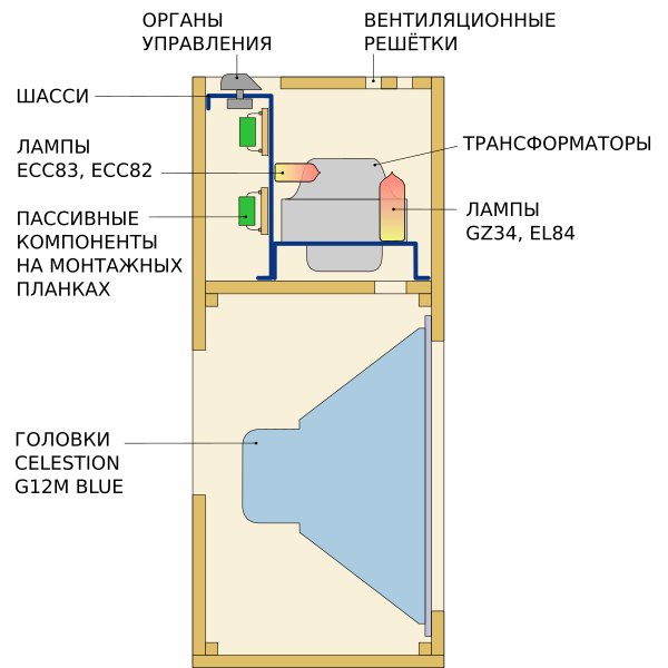 | Громкоговорители | Две 12-дюймовые головки Celestion Blue или Celestion Green |