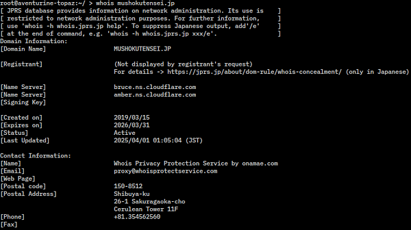 $> whois wikipedia.org NOTICE: Access to .ORG WHOIS information is provided to assist persons in determining the contents of a domain name registration record in the Public Interest Registry registry database. The data in this record is provided by Public Interest Registry for informational purposes only, and Public Interest Registry does not guarantee its accuracy. This service is intended only for query-based access. You agree that you will use this data only for lawful purposes and that, under no circumstances will you use this data to: (a) allow, enable, or otherwise support the transmission by e-mail, telephone, or facsimile of mass unsolicited, commercial advertising or solicitations to entities other than the data recipient's own existing customers; or (b) enable high volume, automated, electronic processes that send queries or data to the systems of Registry Operator or any ICANN-Accredited Registrar, except as reasonably necessary to register domain names or modify existing registrations. All rights reserved. Public Interest Registry reserves the right to modify these terms at any time. By submitting this query, you agree to abide by this policy. Domain ID:D51687756-LROR Domain Name:WIKIPEDIA.ORG Created On:13-Jan-2001 00:12:14 UTC Last Updated On:02-Dec-2009 20:57:17 UTC Expiration Date:13-Jan-2015 00:12:14 UTC Sponsoring Registrar:GoDaddy.com, Inc. (R91-LROR) Status:CLIENT DELETE PROHIBITED Status:CLIENT RENEW PROHIBITED Status:CLIENT TRANSFER PROHIBITED Status:CLIENT UPDATE PROHIBITED Registrant ID:CR31094073 Registrant Name:DNS Admin Registrant Organization:Wikimedia Foundation, Inc. Registrant Street1:149 New Montgomery Street Registrant Street2:Third Floor Registrant Street3: Registrant City:San Francisco Registrant State/Province:California Registrant Postal Code:94105 Registrant Country:US Registrant Phone:+1.4158396885 Registrant Phone Ext.: Registrant FAX:+1.4158820495 Registrant FAX Ext.: Registrant Email:dns-admin@wikimedia.org Admin ID:CR31094075 Admin Name:DNS Admin Admin Organization:Wikimedia Foundation, Inc. Admin Street1:149 New Montgomery Street Admin Street2:Third Floor Admin Street3: Admin City:San Francisco Admin State/Province:California Admin Postal Code:94105 Admin Country:US Admin Phone:+1.4158396885 Admin Phone Ext.: Admin FAX:+1.4158820495 Admin FAX Ext.: Admin Email:dns-admin@wikimedia.org Tech ID:CR31094074 Tech Name:DNS Admin Tech Organization:Wikimedia Foundation, Inc. Tech Street1:149 New Montgomery Street Tech Street2:Third Floor Tech Street3: Tech City:San Francisco Tech State/Province:California Tech Postal Code:94105 Tech Country:US Tech Phone:+1.4158396885 Tech Phone Ext.: Tech FAX:+1.4158820495 Tech FAX Ext.: Tech Email:dns-admin@wikimedia.org Name Server:NS0.WIKIMEDIA.ORG Name Server:NS1.WIKIMEDIA.ORG Name Server:NS2.WIKIMEDIA.ORG Name Server: Name Server: Name Server: Name Server: Name Server: Name Server: Name Server: Name Server: Name Server: Name Server: DNSSEC:Unsigned