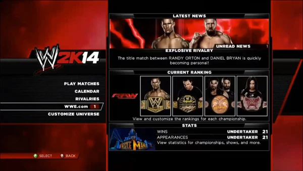 Этот раздел в главном меню Universe Mode представляет собой некую комбинацию из меню Rankings, News и Statistics в WWE '13. Словом, здесь будут собираться все новости, детали и статистика рестлеров/событий, происходящих в режиме. Новости стали более насыщенными, и содержат не только информацию о победах слабого рестлера над сильным, создании команды или победы в титульном матче, но и сводку фьюдов и прочие интересные моменты.