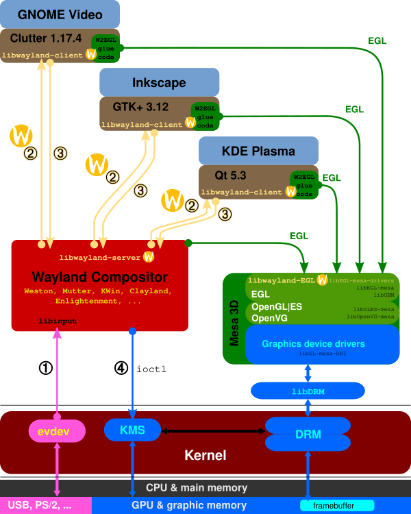 Wayland использует уже существующие в ядре Linux технологии, такие как Kernel mode-setting (KMS), Direct Rendering Manager (DRM) и Graphics Execution Manager (GEM).