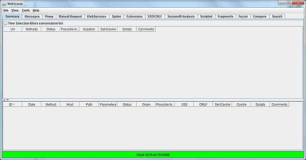 При первом запуске программы отображается ограниченный пользовательский интерфейс, включающий только две панели — Summary и Intercept, предназначенные для базового анализа. Для перехода к расширенной версии необходимо отметить опцию «Use full-featured interface» и перезапустить WebScarab. После этого становятся доступны плагины с расширенными функциями анализа.