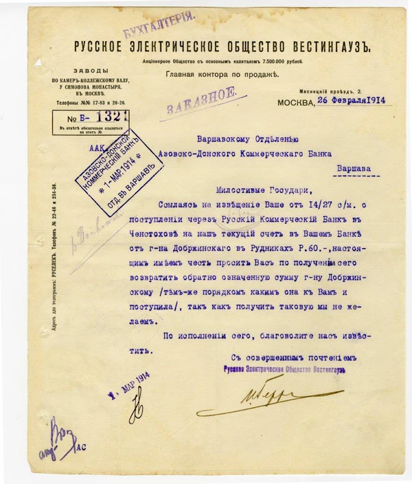 Американская корпорация также внесла свой заметный вклад в активно развивающуюся электротехническую отрасль экономики России начала XX в. В конце 1904 года Санкт-Петербургской городской думой был объявлен международный конкурс на право производства работ по прокладке в столице империи первой линии электрического трамвая. Сделав наиболее привлекательное предложение и тем самым опередив конкурентов из немецких AEG и Siemens, подряд получила компания Westinghouse Electric. Учитывая колоссальный объём работ, который предстояло выполнить фирме-подрядчику, американцами было принято решение приобрести электротехническое предприятие на месте, в России. Выбор пал на расположенный в Москве завод бельгийской компании «Сэнтрелек». 18 октября 1906 года были высочайше утверждены условия деятельности в России Русского электрического общества «Вестингауз». По условиям сделки часть акций новой компании осталась за бельгийцами, а в правление фирмы смогли пройти два представителя французского банка, контролировавшего «Сэнтрелек». Работы были осуществлены в срок и 16 сентября 1907 г. петербургский электрический трамвай в торжественной обстановке отправился в свой первый рейс по маршруту «Главный штаб — 8-я линия В. О.». Не имея в дальнейшем подобных больших заказов, неся ощутимые финансовые убытки, накануне Мировой войны собранием акционеров «Русского электрическое общество Вестингауз» было принято решение продать завод вместе с правами на все патенты "Русскому электротехническому обществу 'Динамо'.[9]
