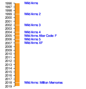 - Wild Arms — первая игра в серии, многие её элементы заложили основу для дальнейших игр серии, такие как тематика вестерна, пустынная планета Филгая и, подарившее название данной серии игр, огнестрельное оружие «ARMs». В этой игре была представлена система инструментов, с помощью которой персонажи могут перемещаться в ранее недоступные участки локаций, а также решать головоломки. Игра вышла на PlayStation в декабре 1996 года на японский рынок, в апреле 1997 года была выпущена на североамериканский рынок, в октябре 1998 года добралась до стран Европы. Wild Arms сочетает в себе двумерную и трёхмерную графику в режиме перемещения, бои происходят на отдельном экране и они полностью трёхмерны[2]. Героям, Руби, Джеку и Сесилии, предстоит защитить пустынную планету от вторжения демонов[16][17].