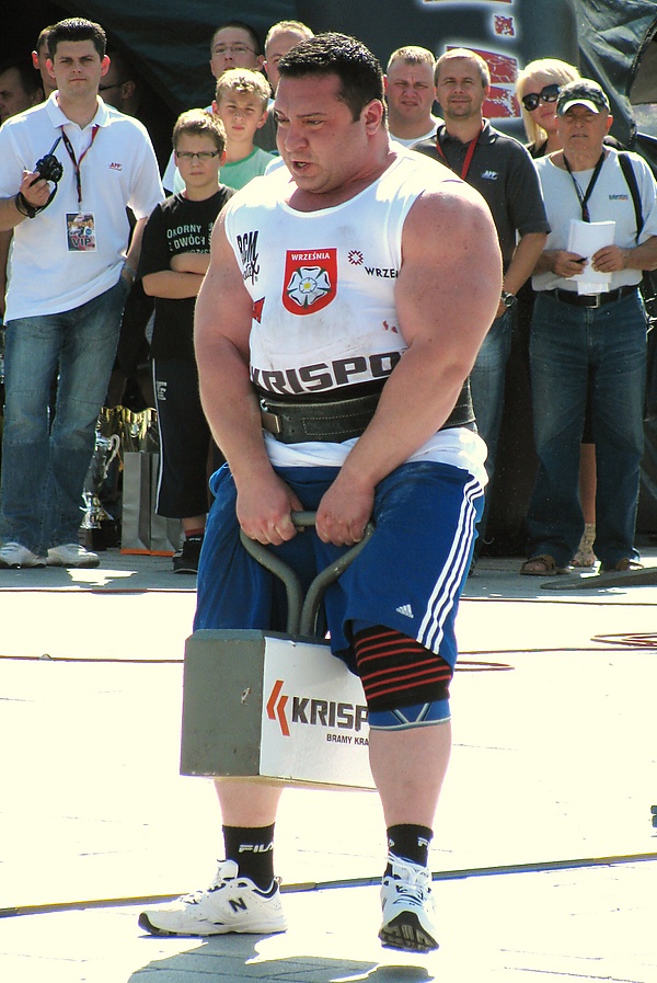- Приседания — осуществляются с большими весами, такими как 900 фунтов (409 кг) кирпичей, кеги, автомобиль, люди на платформе. Подъемы осуществляются либо с максимальным весом на одно повторение, либо на максимальное число повторений с фиксированным (более легким) весом[12].