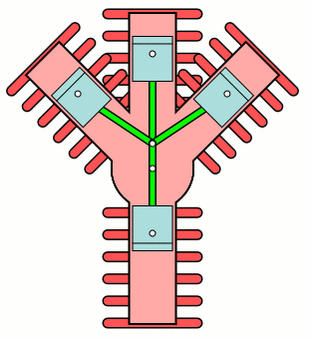 Эта конструкция встречается очень редко, в основном из-за относительного большего веса и сложности в сравнении с радиальными двигателями, хотя они более компактны (при равном количестве цилиндров) в сравнении с V-образными двигателями и всесторонне динамически уравновешены относительно них же. Другими словами, установка балансира для снижения вибрации, как в случае с рядным и V-образным расположением цилиндров, не требуется. Это объясняется тем, что каждая пара цилиндров уравновешивает друг друга во время работы.