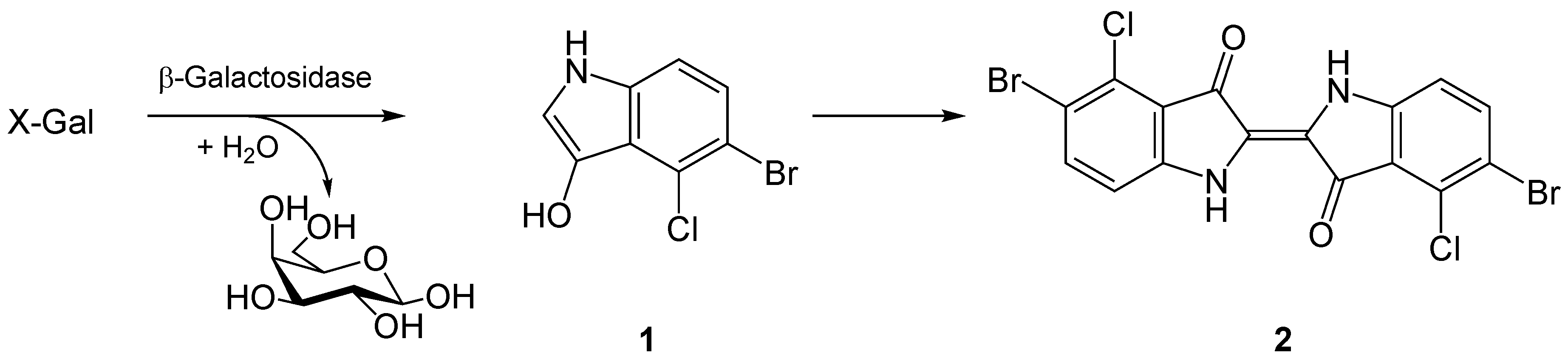X-gal расщепляется β-галактозидазами, при этом образуется галактоза и 5-бромо-4-хлоро-3-гидроксииндол. Последний окисляется в 5,5'-дибромо-4,4'-дихлоро-индиго, нерастворимый окрашенный продукт. В чашку Петри или культуральный флакон вносят X-gal совместно с индуктором β-галактозидаз, например, IPTG.