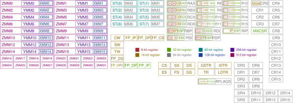 SSE: 8 x 128 бит, x86-64: 16 x 128 бит, AVX: 16 x 256 бит, AVX-512: 32 x 512 бит |
