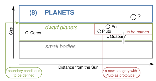Согласно проекту, термин «малая планета» вышел бы из использования, вместо него употреблялось бы «малый объект Солнечной системы» (англ. small Solar System body,так называли бы астероиды, кометы и другие несферические объекты Солнченой системы, кроме спутников), а также создана новая классификация «плутон» (англ. pluton, название этой группы в русском языке совпадает с названием бывшей девятой планеты) для «планет» с орбитальным периодом более 200 лет (то есть все «планеты» за Нептуном) и с необычными вытянутыми орбитами, как та у Плутона. Здесь впервые был употреблён термин «карликовая планета», но официальным его сделать не планировали.[11] Ещё одна проблема — все коричневые карлики тоже попали бы в категорию планет, что было бы неверно.[12]