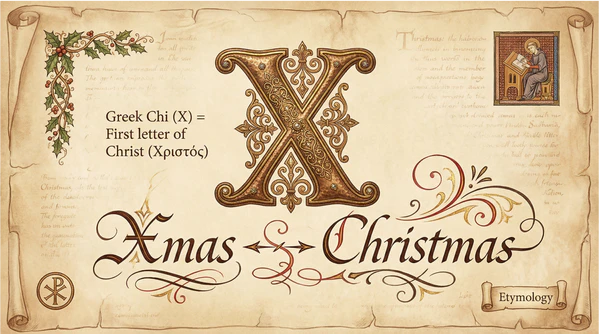 Xmas является аббревиатурой, образованной из двух компонентов: греческой буквы X (хи) и англо-саксонского слова mas, обозначавшего религиозное богослужение[3]. В современном английском языке это сокращение часто произносится как /ˈɛksməs/, хотя исторически оно использовалось как письменное сокращение для слова Christmas /ˈkrɪsməs/. Основное назначение аббревиатуры — экономия места и времени при письме, особенно в контексте рекламы, объявлений и неофициальной переписки.