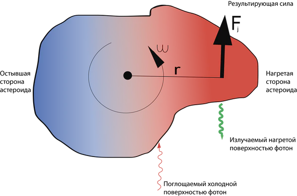 Он заключается в неравномерном нагреве Солнцем поверхности вращающихся небесных тел. Из-за вращения астероида вечерняя сторона его поверхности является наиболее нагретой, поскольку она весь день находилась в зоне действия солнечного излучения и накопила максимум солнечной энергии, в то время как утренняя сторона является наиболее холодной, поскольку она всю ночь излучала полученное ранее от Солнца тепло. Таким образом, тепловое излучение с вечерней стороны астероида намного сильнее, чем с утренней. Это приводит к тому, что с вечерней стороны астероида начинает действовать реактивная сила, возникающая при излучении фотонов с поверхности астероида, которая практически не сбалансирована с утренней стороны астероида, поскольку там поверхность уже успела остыть за ночь. На вращение сферических тел эта сила не оказывает практически никакого влияния, поскольку возникающий реактивный импульс направлен перпендикулярно к поверхности астероида, которая в свою очередь перпендикулярна к радиусу, то есть в случае с телом сферической формы она направлена в центр масс астероида, что может слегка сместить орбиту тела (эффект Ярковского), но не изменит скорость его вращения. В астероиде неправильной формы возникающий импульс также всегда направлен перпендикулярно поверхности, но далеко не всегда к центру масс астероида, а зачастую под углом к направлению на него, что приводит к возникновению вращающего момента, который вызывает появление небольшого углового ускорения, что приводит к изменению скорости вращения астероида в зависимости от изначального направления его вращения.