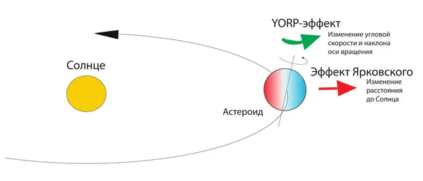 Кроме того, степень влияния эффекта напрямую зависит от расстояния до Солнца: чем ближе к нему астероид, тем сильнее нагревается его поверхность, тем больше реактивный импульс, создаваемый вечерней стороной астероида, и тем сильнее влияние эффекта.