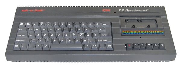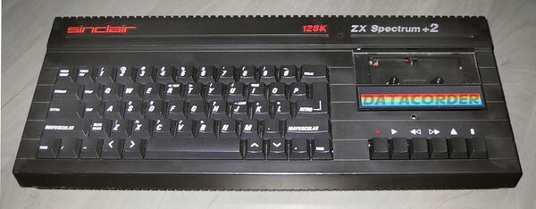 В 1986 году, вскоре после приобретения бренда «Sinclair» и прав на всю линейку «Spectrum»,[37] компания «Amstrad» выпустила ZX Spectrum +2. Машина имела серый корпус с пружинной клавиатурой, двумя портами джойстиков, а также встроенным кассетным магнитофоном, именуемым «Datacorder» (как в «Amstrad CPC 464»), но в остальном машина была полностью идентична «ZX Spectrum 128». Цена производства была снижена, в результате чего розничные цены упали до £139-£149.