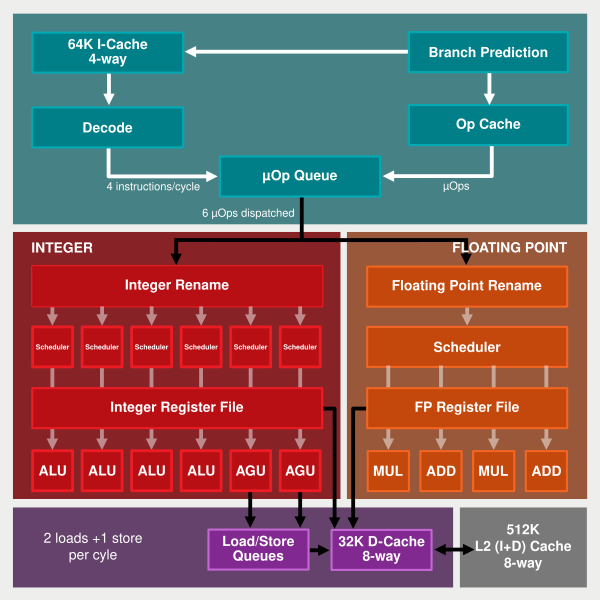 По словам AMD, основное внимание уделялось увеличению количества операций за такт (IPC, Instructions Per Clock).[6][7] Переход от микроархитектуры модулей, используемой в Bulldozer, к полноценным ядрам, как ожидалось, поможет увеличить производительность на ядро в операциях с плавающей точкой за счёт большего количества блоков FPU.[7]