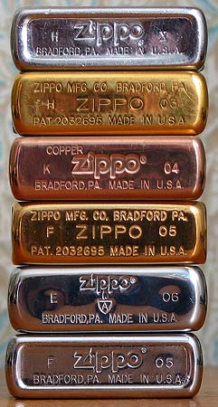 Все зажигалки Zippo с самого первого дня выпуска имеют отличительный штамп на донышке с логотипом Zippo, ранние модели имеют на штампе номер патента[18]. С 1957 года на донышки всех зажигалок Zippo стал ставиться штамп, указывающий на год (позднее и месяц) выпуска зажигалки. До 1966 года год выпуска обозначался последовательностью точек (.) слева и справа от логотипа. С 1966 по 1973 год выпуска обозначался сочетанием вертикальных полосок (|), с 1974 по 1981 — прямыми косыми чертами (/), с 1982 по июнь 1986 — обратными косыми чертами (\). С июля 1986 года штамп несёт информацию также и о месяце выпуска зажигалки. Слева от логотипа буквами от A до L указывается месяц (A — январь, B — февраль и т. д.), справа — год. В 1986 году обозначение года началось с римской цифры II и закончилось в 2000 году цифрой XVI. С 2001 года обозначения годов перешли на арабские цифры, 01 означает 2001 год и т. д. Например, штамп с обозначениями E 04 указывает на зажигалку, произведённую в мае 2004 года.
