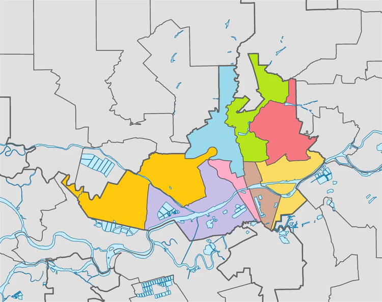 Город разделён на 8 районов.